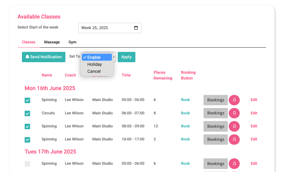 To mark a class as a Holiday, go to the Class Manager page. In the Available Classes section, select the day of the week your class is scheduled—this will display all classes for that week.