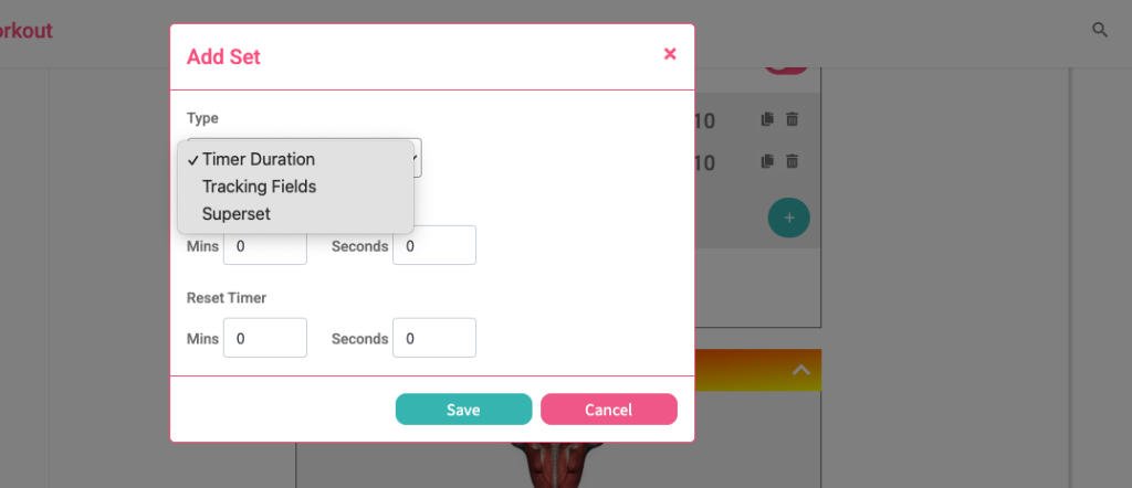 To add a Set to an exercise, just click the green plus (+) icon. This will open a popup window where you can choose the type of Set you’d like to add.