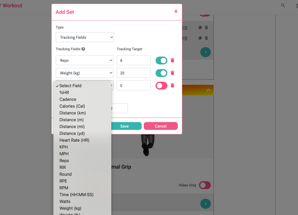 Tracking Fields let you set up to three custom fields per set, so your clients know what to aim for and (if you choose) can track their progress.