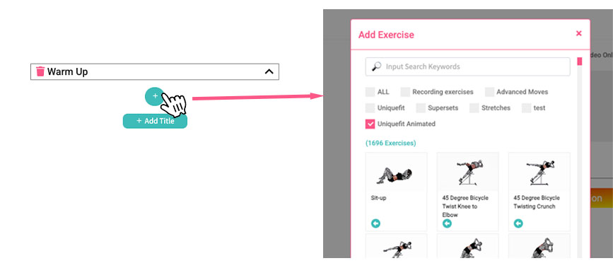 Continue adding exercises until you have completed your first section, once completed click the +Add Title button to add a new title, for example, Workout.